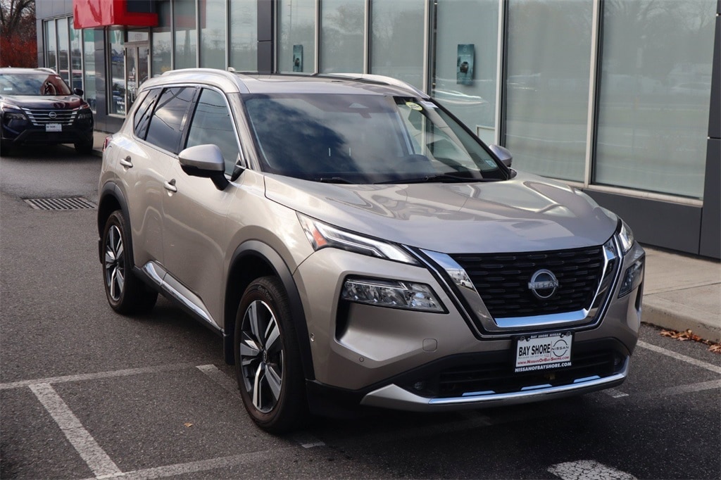 PSD Nissan of Bay Shore is proud to present you with another True Market Priced Pre-Owned Vehicle. This 2022 Nissan Rogue Platinum Nissan Certified is loaded with the following Factory Options: AWD Head-Up Display Package (Heads-Up Display), Nissan Certified Certified, AWD, 10 Speakers, 19" Aluminum Alloy Wheels, 4-Wheel Disc Brakes, 5.604 Axle Ratio, ABS brakes, Air Conditioning, Alloy wheels, AM/FM radio: SiriusXM, Apple CarPlay/Android Auto, Auto High-beam Headlights, Auto-dimming Rear-View mirror, Automatic temperature control, Black Splash Guards (Set of 4), Bose Premium Audio System, Brake assist, Bumpers: body-color, Chrome Rear Bumper Protector, Delay-off headlights, Driver door bin, Driver vanity mirror, Dual front impact airbags, Dual front side impact airbags, Electronic Stability Control, Emergency communication system: NissanConnect Services, First Aid Kit, Floor Mats w/2-Piece Cargo Area Protector, Four wheel independent suspension, Front anti-roll bar, Front Bucket Seats, Front Center Armrest, Front dual zone A/C, Front fog lights, Front reading lights, Fully automatic headlights, Heated door mirrors, Heated Front Bucket Seats, Heated front seats, Heated rear seats, Heated steering wheel, Illuminated entry, Knee airbag, Low tire pressure warning, Memory seat, Navigation system: NissanConnect Navigation, Occupant sensing airbag, Outside temperature display, Overhead airbag, Overhead console, Panic alarm, Passenger door bin, Passenger vanity mirror, Power door mirrors, Power driver seat, Power Liftgate, Power moonroof, Power passenger seat, Power steering, Power windows, Quilted Semi-Aniline Leather Seat Trim, Radio data system, Radio: AM/FM NissanConnect w/Navigation, Rear air conditioning, Rear anti-roll bar, Rear reading lights, Rear seat center armrest, Rear side impact airbag, Rear window defroster, Rear window wiper, Remote keyless entry, Roof rack: rails only, Security system, Speed control, Speed-Sensitive Wipers, Split folding rear seat, Spoiler, Steering wheel mounted audio controls, Tachometer, Telescoping steering wheel, Tilt steering wheel, Traction control, Trip computer, Turn signal indicator mirrors, and Variably intermittent wipers!!